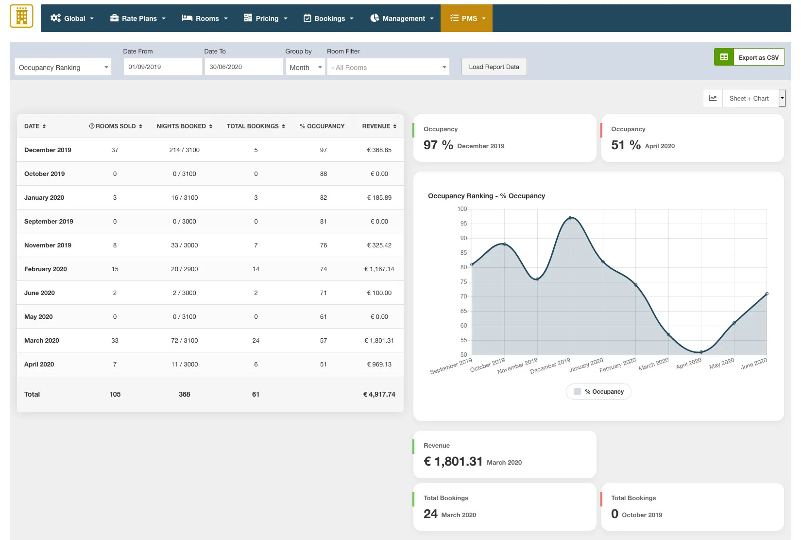 Maximiza la ocupación de tu hotel con herramientas como gráficos de previsión y paneles de control detallados.